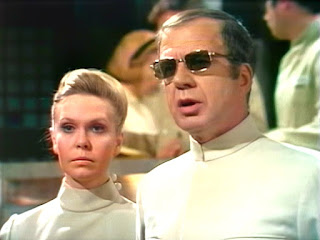 I love how costume designer Christine Rawlins redresses the parallel universe characters to make the RSF staff more rough and ready (more like Mussolini's Blackshirts), and the scientists more clinical. Their white uniforms are neat and white, and Stahlmann wears sunshades which render him unreadable, while Petra's hair is worn up and coiffed. Also, Petra now wields real power as the professor's second in command, demonstrated when the much more inhibited Greg Sutton tries to impose his opinion, only to be swatted down and threatened by Dr Williams (this is how it should have been all along!). And in this parallel world, which is slightly ahead in time of "ours", Sir Keith Gold has been killed in a car accident on the way to cause ructions in London. Coincidence, that...