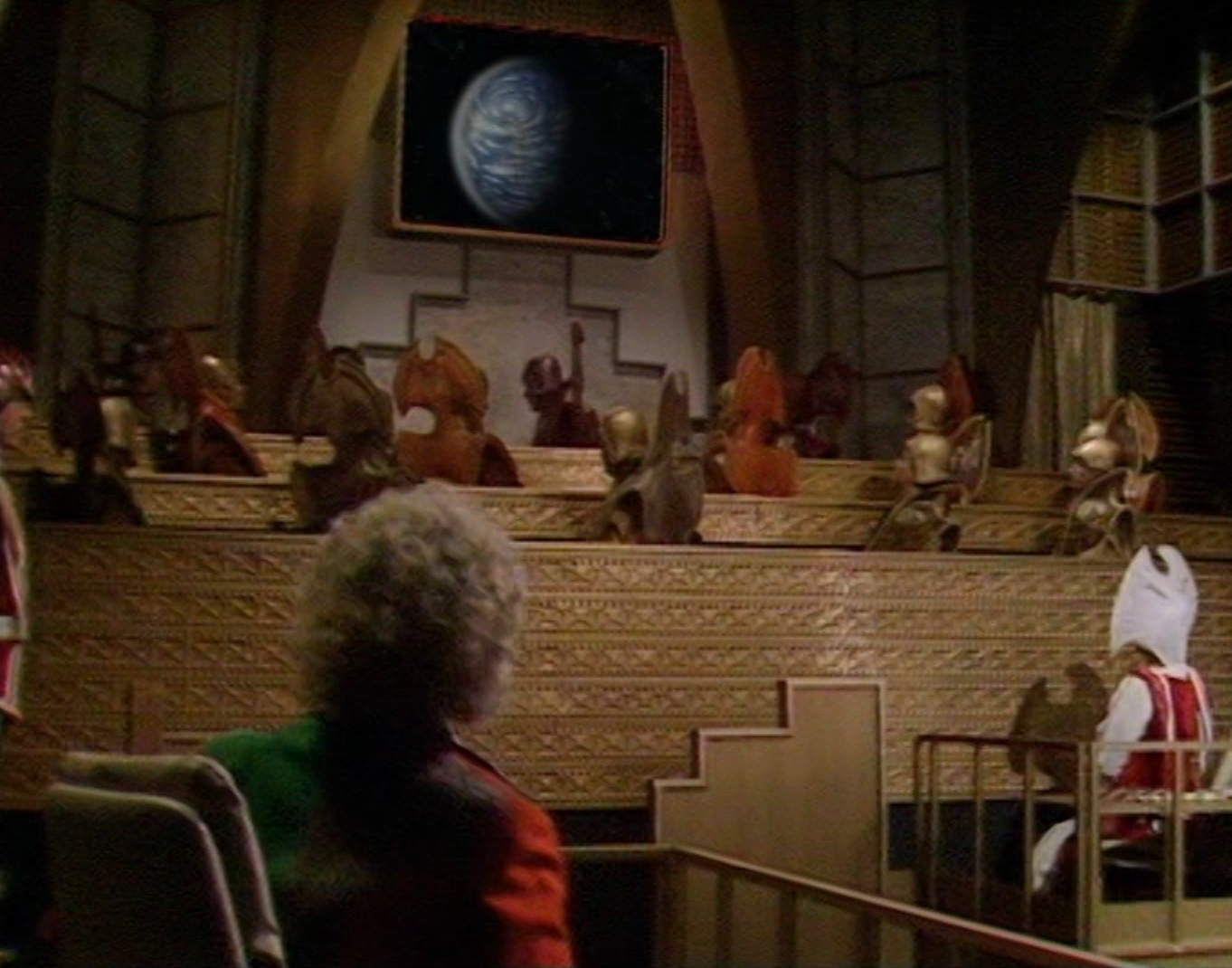 There's an underlying wit to Robert Holmes' dialogue in the inquiry scenes, as if winking to the audience. These scenes occasionally interrupt the main action throughout the season, like an intergalactic Gogglebox giving a running commentary on what we're watching. Holmes "gets" this dynamic, and uses the interjections to perhaps voice the thoughts of the viewer at home. "Why do I have to sit here watching Peri getting upset, while two unsavoury adventurers bully a bunch of natives?" asks the Doctor, then: "As a matter of interest, where is Peri?" Exactly what we'd been wondering... The Valeyard's ominous retort tells us that Peri's whereabouts shall remain a mystery for now: "Where you left her." Is Peri safe? From which adventure was the Doctor plucked? All very intriguing...